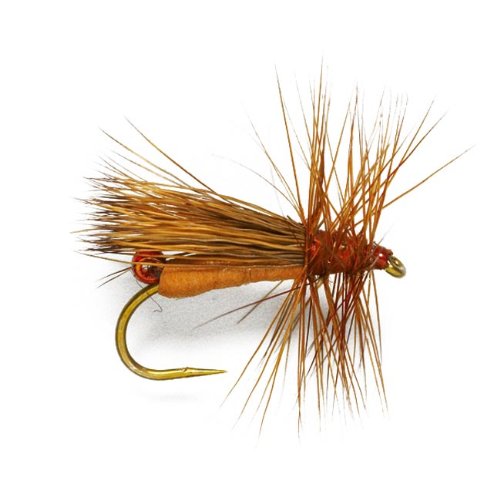 This dry fly uses a green bead in the rear to imitate an egg sac and allow the fly to sit a bit deeper in the film like an oviposting caddis female. Skate this caddis dry fly a bit and watch out. Color, Green, Brown. Dry fly in sizes: 12, 14, 16.